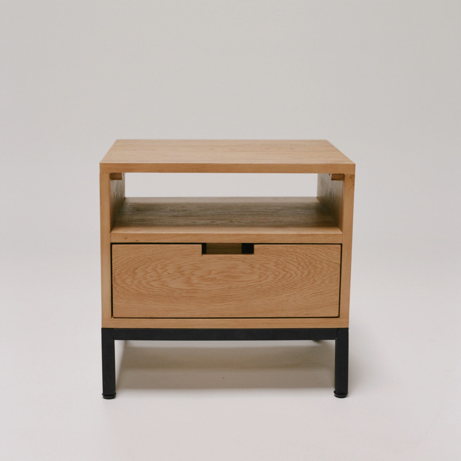 ...The Case Side Table features solid American white oak and a blackened steel base. The body features an open-back shelf for quick access to charging cables and a closed bottom drawer to put things out of sight.